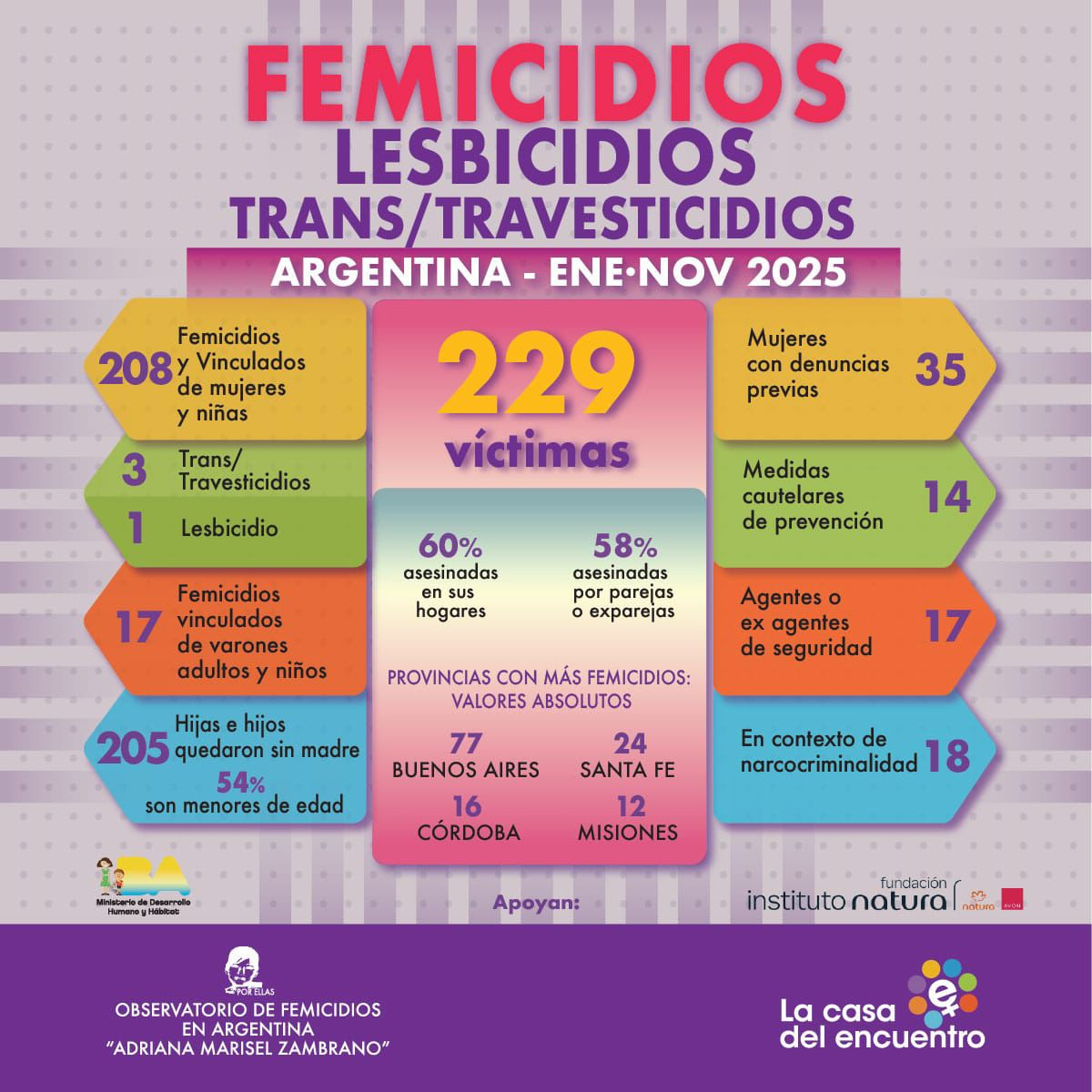 Desde el 1° de enero al 30 de noviembre de 2025, se produjeron 208 femicidios y vinculados de mujeres y niñas, 1 lesbicidio, 3 transfemicidios y 17 femicidios vinculados de varones adultos y niños, según un nuevo informe del Observatorio de Femicidios en Argentina “Adriana Marisel Zambrano” que dirige La Casa del Encuentro.