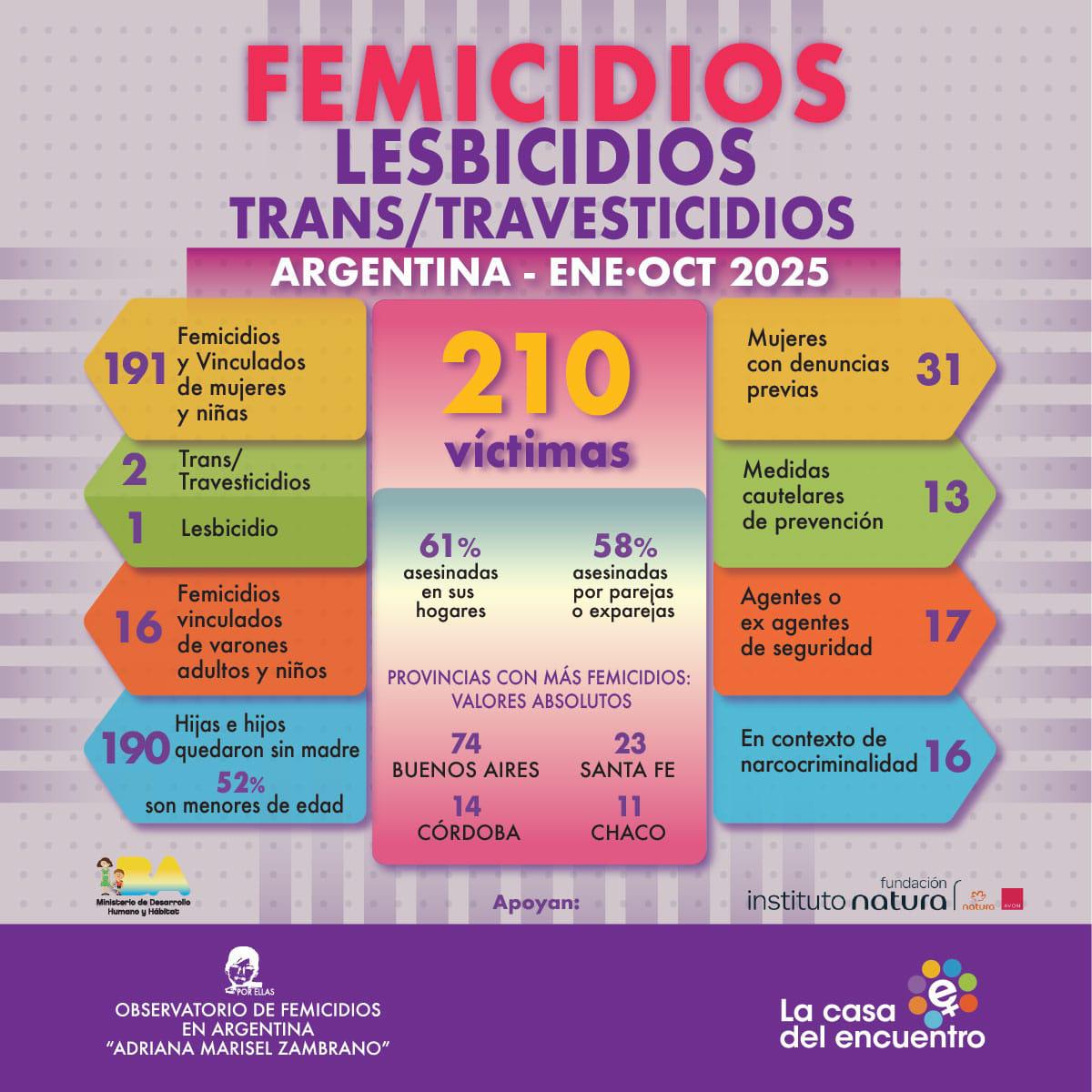 Desde el 1° de enero al 31 de octubre de 2025, se produjeron 191 femicidios y vinculados de mujeres y niñas, 1 lesbicidio, 2 transfemicidios y 16 femicidios vinculados de varones adultos y niños, según un nuevo informe del Observatorio de Femicidios en Argentina “Adriana Marisel Zambrano” que dirige La Casa del Encuentro. Los datos más relevantes son que 190 hijas/hijos quedaron sin madre, el 52 % son menores de edad; el 58 % de los agresores eran parejas o exparejas. Como cada informe lo demuestra, el lugar más inseguro para una mujer en situación de violencia continúa siendo su vivienda o la vivienda compartida con el agresor (61 % fueron asesinadas en su hogar). Y si bien los femicidios abarcan el territorio nacional, en términos absolutos Buenos Aires sigue siendo la provincia con más casos, seguida por Santa Fe, Córdoba y Chaco. Comunicación: Alejandra Benaglia: alebenaglia@hotmail.com/ 11 2320-4423