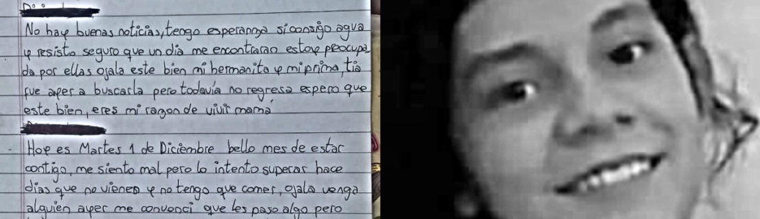 (APL) «No hay noticias buenas, tengo esperanzas si consigo agua y resisto, seguro que un día me encontrarán, estoy preocupada por ellas ojalá estén bien mi hermanita y mi prima, tía fue ayer a buscarlas pero todavía no regresa, espero que esté bien, eres mi razón de vivir mamá». Este texto es del Diario de … Sigue leyendo «Impulsemos la búsqueda de Lichita»