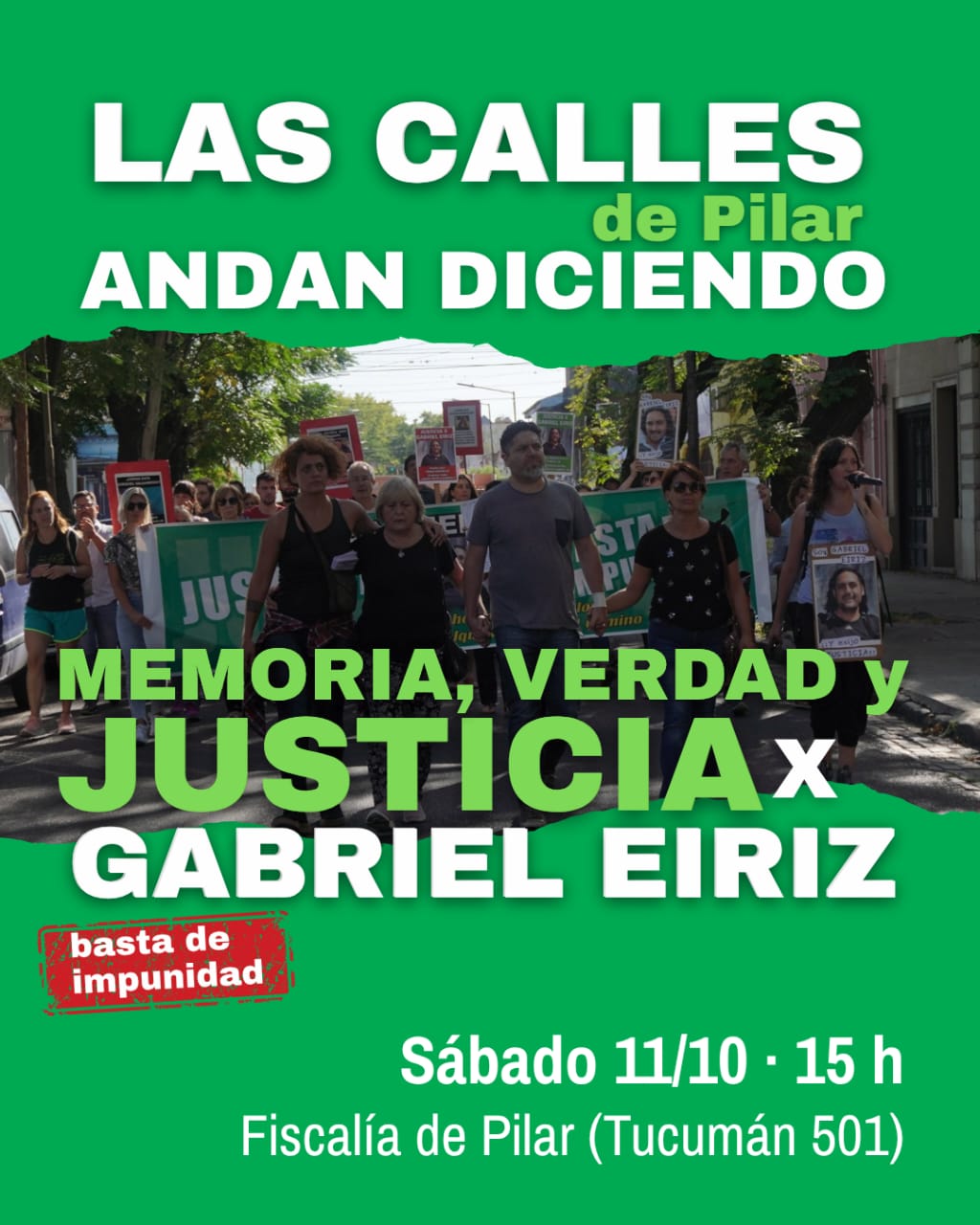 📣 Este sábado 11/10 nos vemos en #Pilar para marchar por el ya conocido «circuito de la impunidad» (fiscalía, municipio, policía). La marcha culmina en Tucumán al 700 donde habrá micrófono abierto, mateada y merienda mientras restauramos el mural en memoria de Gabriel. 🔥 Acompañanos a hacer #JusticiaporGabrielEiriz 🗣️ Sumate a alzar la voz para denunciar con rabia la impunidad del crimen. Sumate a la jornada para seguir haciendo memoria colectiva y para recordar a Gabi con amor y ternura. Traé tu mate, reposera y algo para compartir para el momento del cierre y merienda.