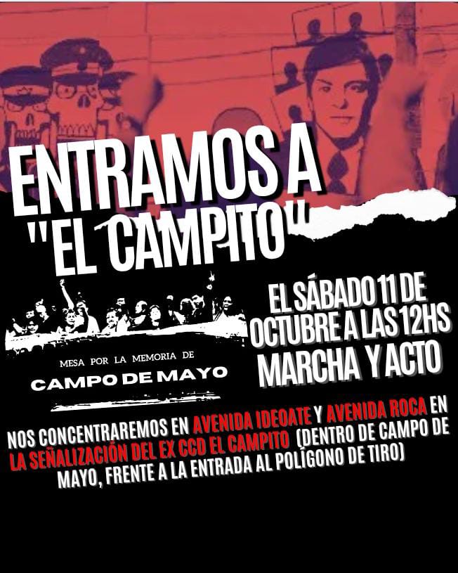 (Por Iris Pereyra*) Este sábado 11 de octubre a las 12 hs. marcharemos a “El Campito”. El mayor campo de concentración del país, Ubicado en Campo de Mayo. Av. Ideoate y Roca. Campo de Mayo.Frente al Polígono de Tiro en Campo de Mayo. Honraremos a todos los secuestrados/desaparecidos en Campo de Mayo y volveremos a reclamar por la construcción del Espacio para la Memoria en Campo de Mayo que ya lleva 19 años de retraso. Participarán organizaciones políticas y sociales luchadores por los derechos humanos de ayer y de hoy.Organiza Mesa por la Memoria de Campo de Mayo.